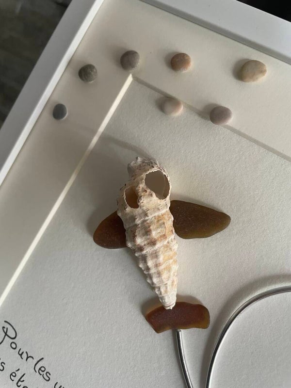 Cadre carré blanc 22 cm. Décor métal, coquillages et galets.